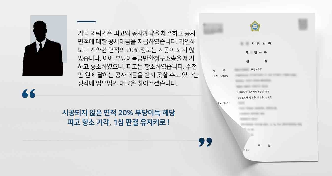 기업 의뢰인은 공사대금을 돌려받기 위한 소송에서 승소하면서 수천만 원에 달하는 부당이득금을 받을 수 있었습니다.